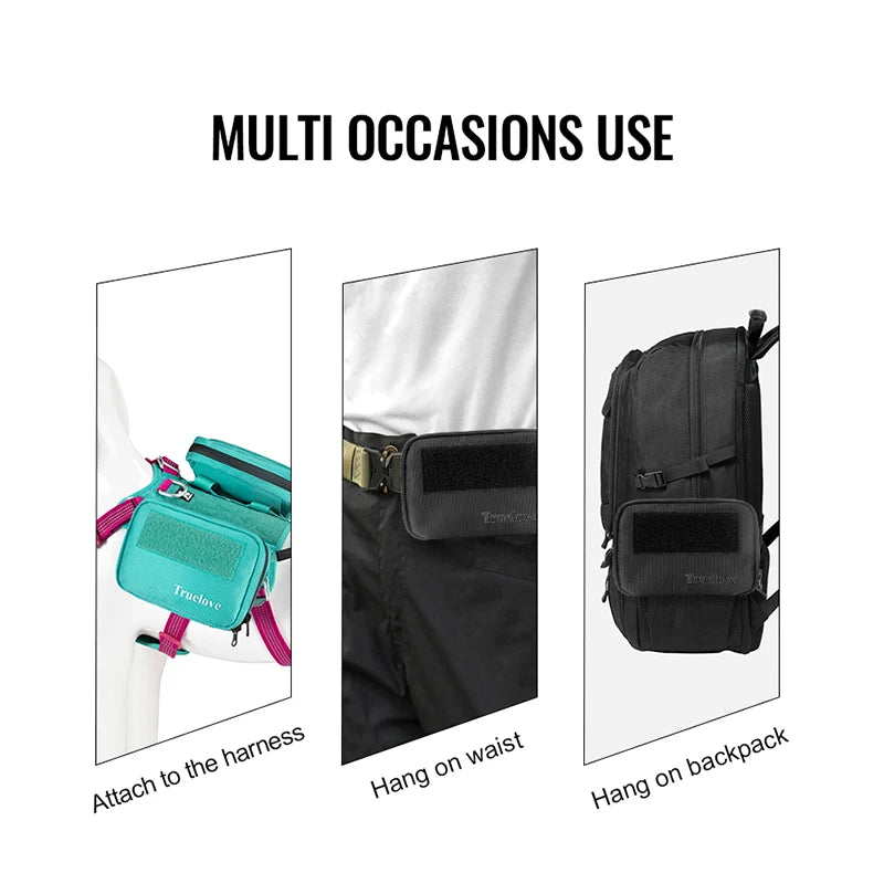This set includes two horizontal dog pouches that are convenient for carrying toys, treats, foldable bowls, and your everyday essentials during walks and outings.safety and the ability to attach them to dog vests and harnesses, these pouches will become you and your pup's favorite everyday carry accessory!